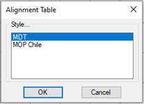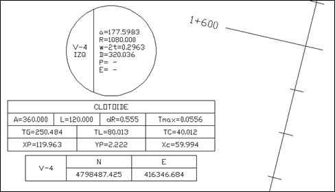 The purpose of this command is to represent boxes containing the information on singular and representative elements of each vertex of a horizontal alignment in ground plan view. The program asks the user to select a horizontal alignment for the drawing and then a window appears in which you can choose the style with which the alignment boxes are labeled.