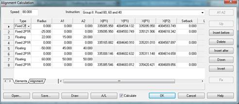 On the right of the window there is an operations' column which operates on the alignment selected on the list. The Up and Down buttons allow an alignment to be moved within the list. The Delete button eliminates it and the Invert button exchanges the initial and final points of the alignment as well as the radius sign, resulting in the inversion of the direction of travel of the alignment at this alignment. For an element which is not fixed and which has been calculated, the Fix button converts it into a fixed alignment, taking its initial and final points from the calculation. Finally, the Insert before and Insert after buttons allow the graphic designation of a layout element and its addition to the list, being inserted at the position before or after that of the cursor.