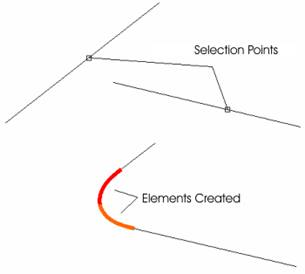This command allows a sequence of two clothoids (also known as a vertex clothoid) to be inserted between two straight lines, so that the initial and final points of the set are tangential to each of the straight lines.