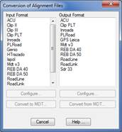 Likewise, if any format on the Output Format list is selected, the Convert from MDT button will automatically be enabled. Once this button is clicked, the source file containing the MDT alignment will be requested. Then the output file to where the alignment information will be transferred with the format previously selected. Optionally, the Configure button may be activated, where any special characteristics the format selected has can be specified.