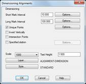 This tool is used to dimension an alignment following standard criteria. The program requests the horizontal alignment drawn on screen and then activates a dialog box. where the characteristics of the marks to be drawn should be entered.