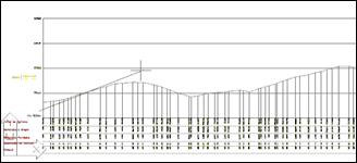 This other kind of definition initially displays the same sub-menu as the Station and Height option. Once the first item of data (station) is entered, the program requests the height and then displays the terrain’s data at the point desired by default. After the first point is thus specified, it requests the Distance from the alignment from the first to the current vertex. When this distance is entered, the program requests its Slope. It then creates the new alignment vector based on the previous one and with the distance set. The program will continue to request distance and slope until it is given a null response. Once the grade line has been defined, the program assumes the alignments and matches them to the parameters of the profile’s orthogonal projection.
