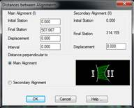 This tool provides users with information regarding distances equivalent stations existing on two different horizontal alignments. Firstly, the two horizontal alignments must be selected. Then the following dialog box is displayed: