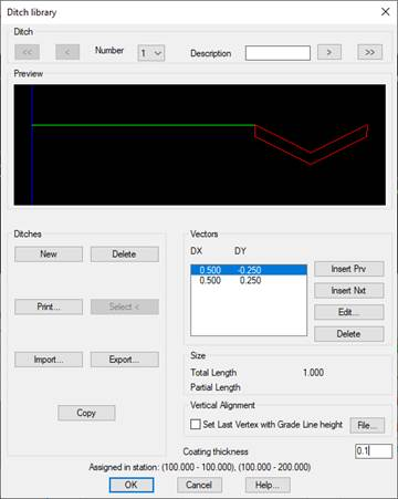 Vectors: The group of vectors comprising the ditch, with the corresponding buttons to insert, edit, or delete them.