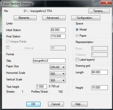 When this command is executed, the program initially displays the .TRA and .SEG file templates and goes to the last folder used. By selecting or keying in a name, one goes to the parameter definition window, where the different options applied to drawing cross-sections can be configured.
