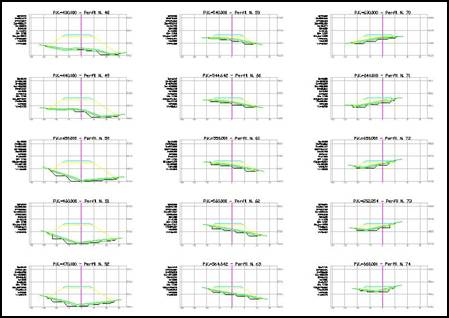 When this command is executed, either the natural terrain cross-sections (.TRA extension), skew profiles (extension .TRE) or the segment containing all the information on the road generated (see Definition of Segment in the Alignments section) is drawn.