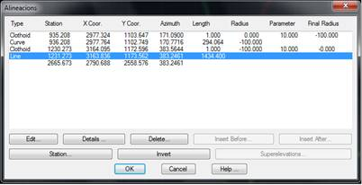 Edit: Displays a window where the road design element selected can be modified. The dialog box depends on whether it is a straight line, a curve or a clothoid.