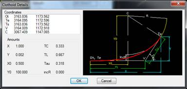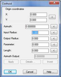 Output Radius: Radius of the clothoid at its end point. The sign will be the same as the entry radius. When the value of the radius is edited, length is automatically modified while the parameter is maintained