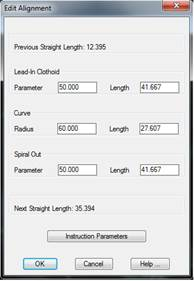 This utility allows curved or clothoid-type alignments to be modified. In order to do so, the alignment to be modified must be selected and the program displays the following dialog box: