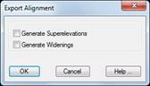This command is complementary to Alignments > Import Alignment. In other words, it generates a file in the selected format from a horizontal alignment drawn on screen which will subsequently be used for other commands such as, for instance, defining segments, obtaining profiles, setting out, etc.