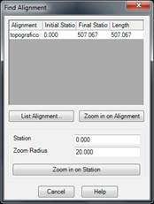 When an alignment on the list is selected, the buttons used to localize the alignment are enabled. Zoom in on Alignment resizes the CAD window so that the polyline representing the alignment selected is wholly visible and selects it automatically. Zoom in on Station resizes the window and centers on the Station specified. Zoom Radius sets the drawing area visible around the point The List Alignment button allows a list of the alignment selected to be obtained.