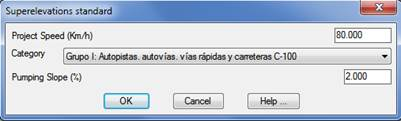 Category: We establish the category of the road to be defined and in line with this choice one or another cant table will be selected. These categories will be depending in the Roads Standards selected under Configuration.