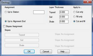 Layer Thickness: The thickness of the different types of terrain comprising the section are set. This value will be used in the assignment of cutting slopes to specify the type of slope assignment.