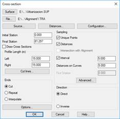 When this command is executed, cross-sections are obtained from 3D objects or MDT surfaces. There are different methods to obtain them. Initially, the program requests the horizontal alignment from which to obtain the profiles, which can be designated on the screen or by selecting the relevant file. The following dialog box then appears: