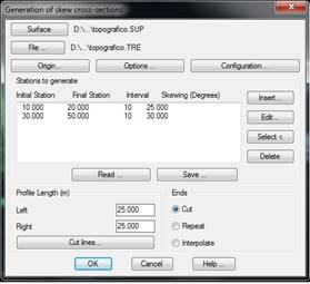 This command is useful to generate profiles that are not normal to the horizontal alignment. It is possible to indicate the angle of inclination with regard to the horizontal alignment of each cut or group of cuts. This angle is specified in grads with a margin of +- 100 degrees, in which the value of zero is considered normal to the horizontal alignment.