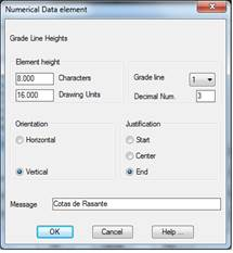This numerical data element will only be drawn if the segment contains a defined grade line. It represents the grade line heights of the grade line contained in the segment selected. The dialog box shown below is then displayed A description of its characteristics follows.