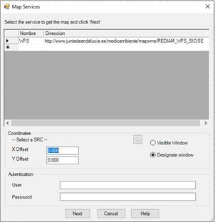 On executing the command, a window appears with a list of the different services configured in the program. This list includes a Name to identify the service, and a Web address to which the request for the map can be made. Items can be added to the list by typing on the line marked with *. Moreover, we need to specify the design of the drawing, and if we wish to obtain an image that occupies the entire visible drawing area or designate a smaller window.