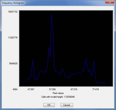 Clicking on the Histogram tab will show the distribution of the grid values. The X axis on the graph shows values of the heights, while the Y axis shows the absolute frequency (number of pixels with this height value). Hence, the distribution of heights in the grid is shown in an intuitive manner. The number of cells with no defined height is also shown.