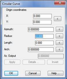 Azimuth. Initial azimuth of the circular curve, in hundredths of a degree. Its value may be typed into the relevant box or it may be designated graphically with the < button situated to its right.