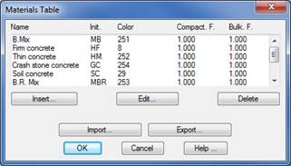 The materials that will make up the roadbed layers of a previously defined roadbed are set in this option. A list containing all the materials that will comprise or form part of the layers is entered in the following dialog box. The information is stored in a file with a .MAT extension, and it can be used in any other subsequent project. The materials defined can be Imported and Exported.