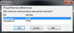 This command allows one to modify an existing grid file by including the cells belonging to another grid file. The program requests the two grid files involved in the process and checks to see if they have the same cell size. Should they not have the same cell size, a dialog box is displayed where one can choose the cell size. This is equivalent to executing the Resample Grid command on one of the files.
