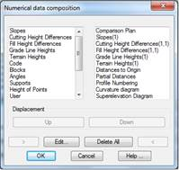 The dialog box consists of two lists. The one on the left displays the elements available and the one on the right displays the current status of the numerical data. The order latter is the order which will appear on the drawing. There are a series of controls on the bottom which help one to configure the numerical data.