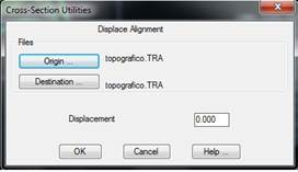 When the command is executed, the following dialog box is displayed, where one enters the Origin and Destination files, together with the Displacement to be applied in relation to the horizontal alignment.