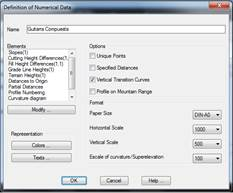 The type of numerical data to be represented on the longitudinal profile drawing is edited here. The SIMPLE.GTR numerical data file is selected by default. To change the default numerical data file, one must access configuration (see Customization Manual).