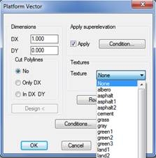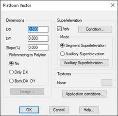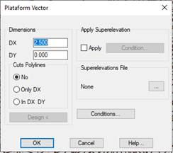 Apply superelevation: Indicate whether the vector can be superelevated. Click on the Condition button to customize the superelevation to apply.