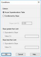 The superelevation will either be applied As per Superelevations Table or Conditioned by Slope. In the latter case, there are two criteria for the application of said slope: it can be either greater than or less than the limit set. There are two criteria for both alternatives: