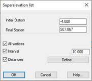 Activate superelevation: Activates the superelevation in the vector selected, for all definitions at every station.