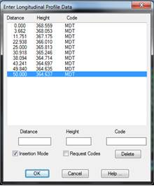 Possibility of entering or modifying a longitudinal profile, element by element. Once this command has been executed, .LON file will be requested. Then a dialog box will be displayed containing the profile’s data should it exist or empty if no data has yet been entered.