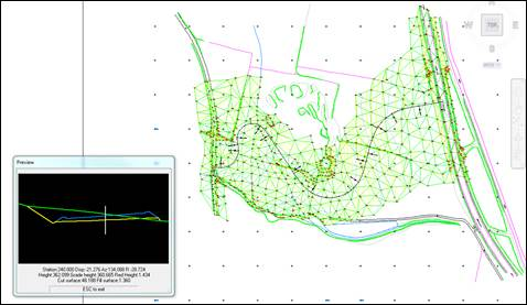 With this command, with the drawing of the road or surface in top view, we can interactively visualize the cross-section according to the station where the cursor is located.