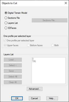 Layers List: This option allows one to cut any drawing element with elevation. In order to do so, the relevant layers whose elements are represented in 3D are selected using the cursor. The digital model can also be included in the selection by marking the TRI layer. Activating this option enables the Layers List box, from which the layers containing the 3D information can be selected.