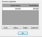Select: This option enables the graphic selection on the drawing of the structure’s initial and final stations. The station is calculated projecting the point selected onto the working horizontal alignment.
