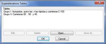 Open: Enables us to select a new superelevations table to insert in the list. The Generate Superelevation from Alignment command will activate all the tables we have configured in this section.