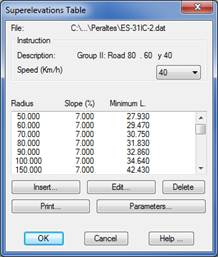 Optionally, the table may be modified or customized depending on the road design characteristics and the speed assigned to them. The superelevation file is initially requested. Then a dialog box is displayed showing the file’s configuration. Each of the superelevation tables may have different values according to the road design’s speed. The features of the dialog box are described below.