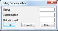 Insert and Edit: Any of the records appearing in the superelevations table may be entered or modified. When any of these buttons is activated, the following dialog box is displayed, where the changes are made.