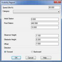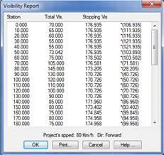 Once the dialog box options are validated a report is displayed on-screen, showing the current visibility for each Station, calculated from the intersections with the digital terrain model and the stopping visibility. Stopping Visibility is considered the distance along the length of a lane road that exists between an obstacle on the roadway and the position of a vehicle circulating toward said obstacle, in the absence of intermediate vehicles, at the moment at which the obstacle can be discerned and does not disappear from sight until reaching it.