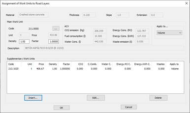 There is the possibility of assigning several complementary works units to the material of a certain layer. These assignments are managed using the “Insert”, “Edit” and “Delete” buttons.