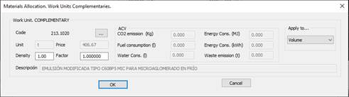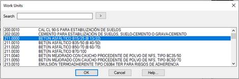 Assignment of the main works unit. Clicking on the (…) button will display the following window containing the different works units available in accordance with the BC3 database selected (see Settings > BIM). We select the works unit to assign to the selected pavement material.