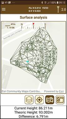 ·Height diff.: Difference of height between the GNSS height and the current selected surface.