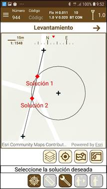 La aplicación pedirá al usuario en primer lugar que seleccione los dos puntos que forman la línea y, seguidamente, el punto que será el centro del círculo, tras lo cual deberá escribir el radio de éste. En este caso, puede ocurrir que no haya solución si la línea y el círculo están separados; que sólo haya una solución si la línea es tangente al círculo, o que haya dos soluciones si la línea corta al círculo. La aplicación mostrará la línea y el círculo y la intersección entre ambos y, en caso de ser más de una, pedirá que se elija cuál de las dos se desea grabar.
