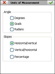 In this section it is possible to select the slopes and angle units which are going to be worked with in the application. By default you work with angles in centesimal degrees and slopes in horizontal increment/ vertical increment.