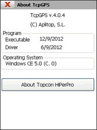 Information about the Application, as well as the field recorder’s and GNSS Receiver’s Operating System are displayed in this window.