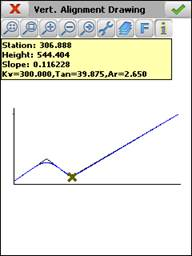 Information about the station selected, the slope of the section to which the said station belongs and the height are shown by clicking on the screen. If the point selected projects onto any of the transition curves defined, the kv/radius, the tangent and the corresponding arrow will additionally be shown.