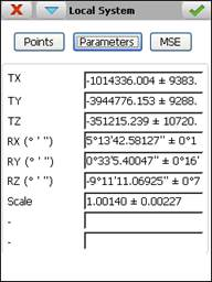 By Parameters : Directly entering the values of the transformation equation parameters. Displacements must be entered in metres and the angle format must be sexagesimal in degrees, minutes and seconds (separated by space) and in an anti-clockwise direction with 0 in the East.