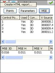 By contrast, if the MSE button is pressed, the screen is accessed which shows the mean square error and the maximum residuals of each x, y, z component. Depending on the size of the transformation, the following square errors are calculated: