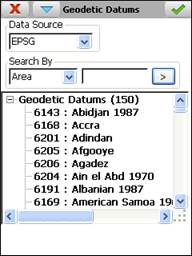 The Search By section allows the filtering of consultation data by Code, Name and Area. This latter option is only available for EPSG data. The zone name (continent, country etc) must be specified in English. The string to be searched must be entered in the box on the right and the button pressed. If searching by code, this will only show the result if this same code can be found on the data base, whilst in the search by name and area, this will show all the geodetic datums whose name or area contains the string entered.