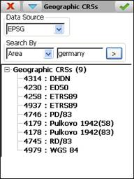 The Search By section allows the filtering of consultation data by Code, Name and Area. This latter option is only available for EPSG data. The zone name (continent, country etc) must be specified in English. The string to be searched must be entered in the box on the right and the button pressed. If searching by code, this will only show the result if this same code can be found on the data base, whilst in the search by name and area, this will show all the CRS whose name or usage area contains the string entered.
